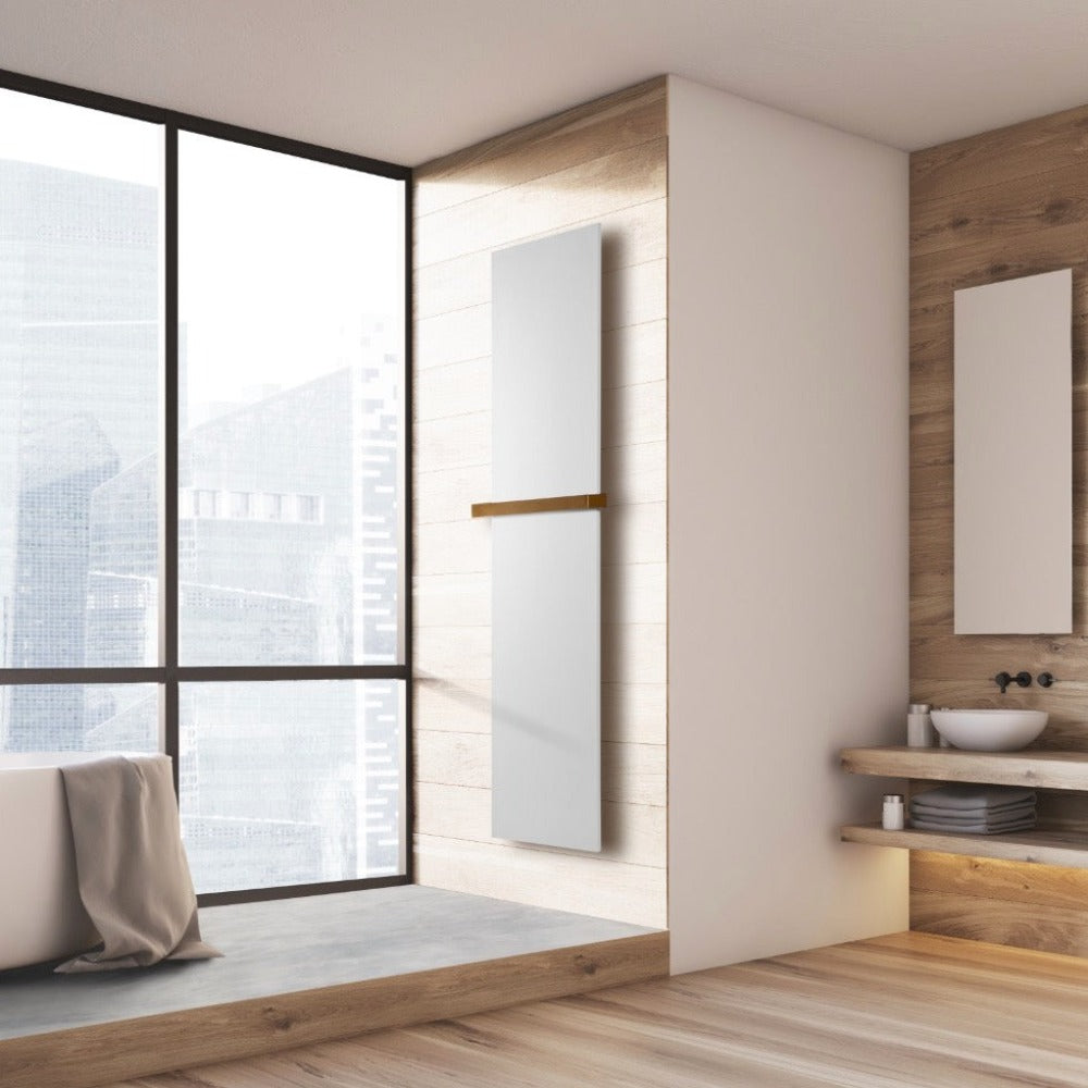 Radiateur sèche-serviettes électrique ultra-plat, au design très moderne, finition monochrome blanc mat.