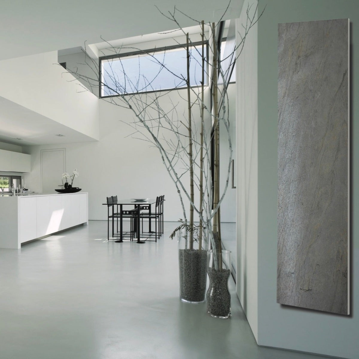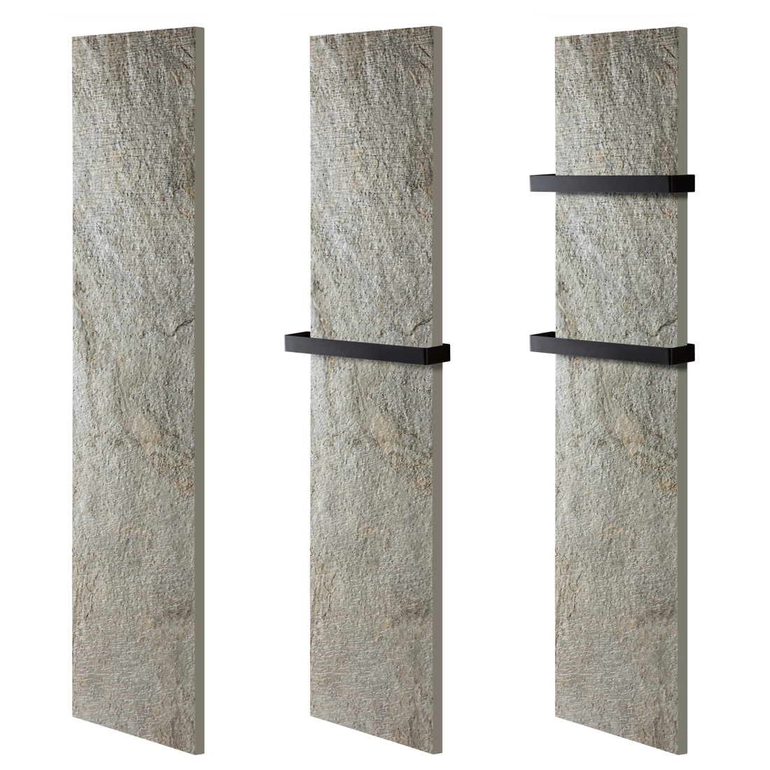 Radiateur sèche-serviettes électrique ultra-plat, au design très moderne, finition pierre naturelle ardoise.