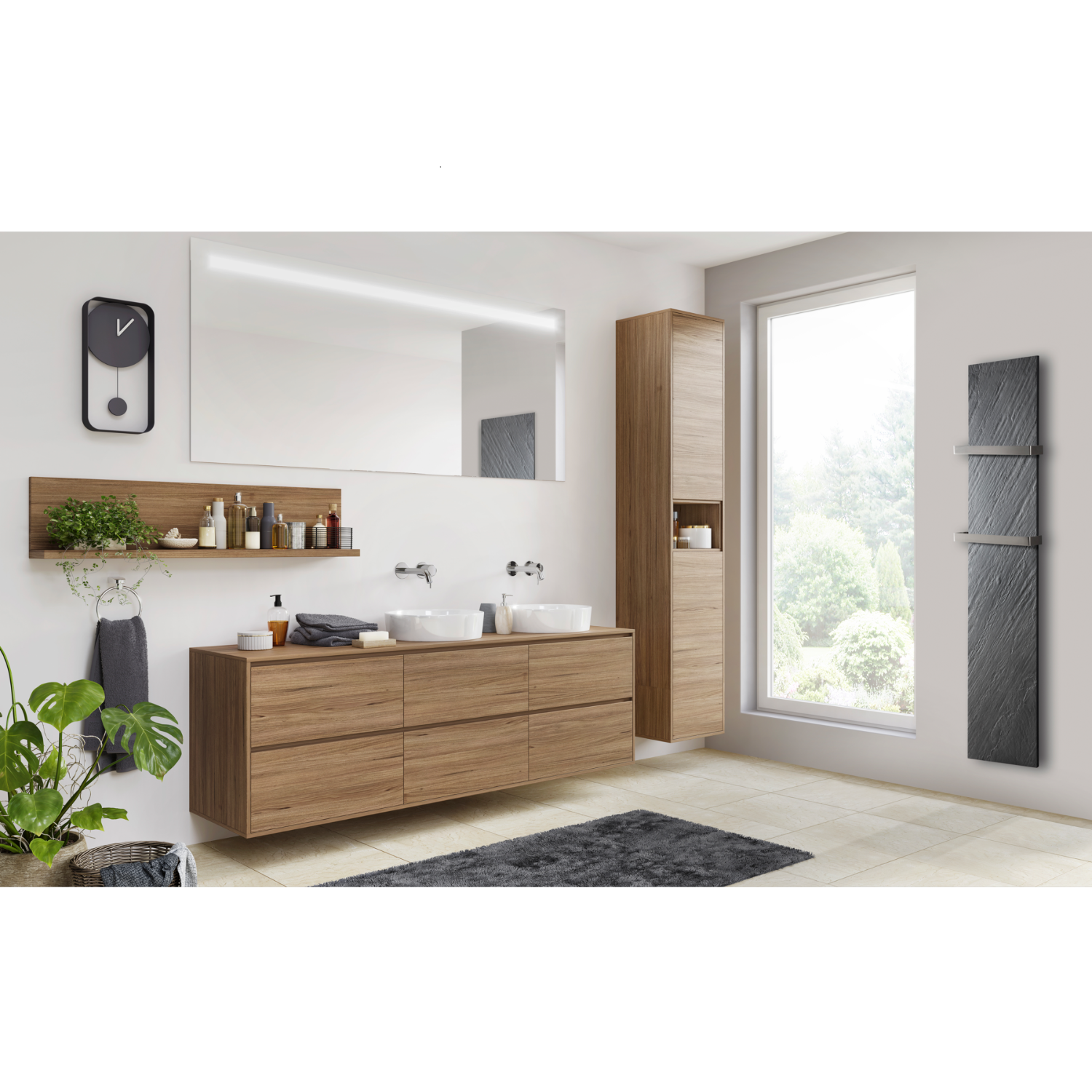 Radiateur sèche-serviettes électrique ultra-plat, au design très moderne, finition pierre naturelle graphite.