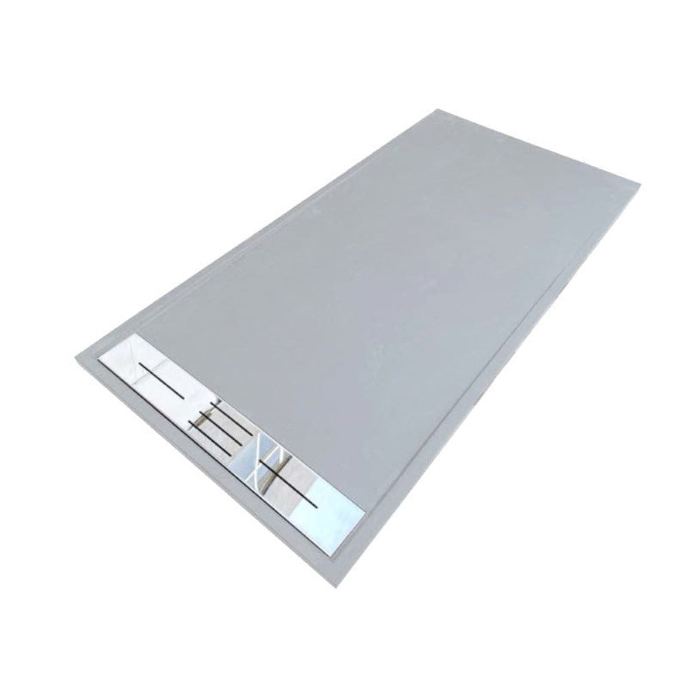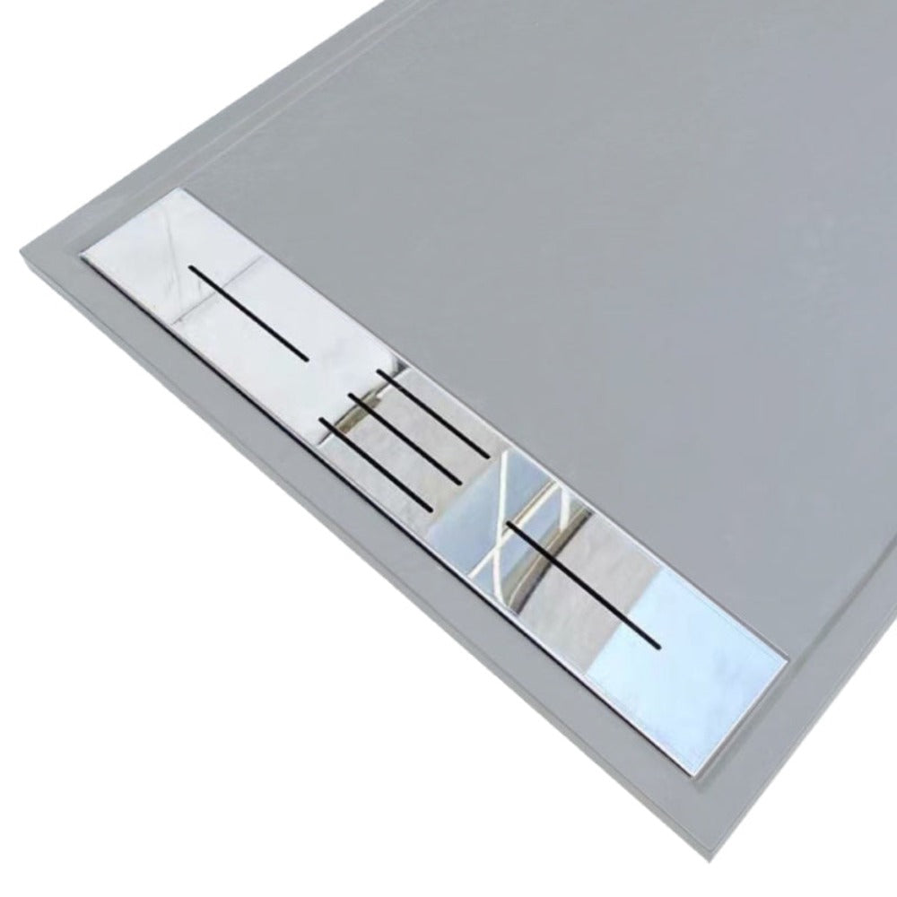 Receveur de douche extra plat gris LUCIA en SoliCast® pour une douche à l'italienne ultra-contemporaine, grille en acier inoxydable de finition mat incluse, pour une évacuation caniveau tendance.