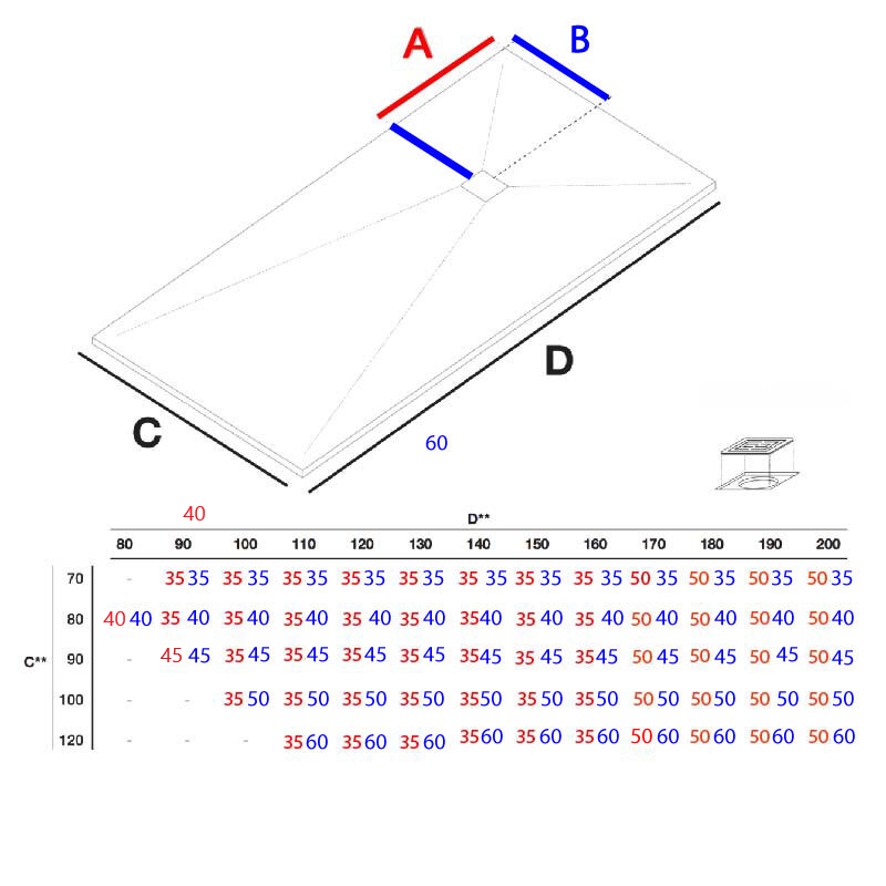 - Pour les receveurs de 80 cm, la grille est à 40 cm du bord