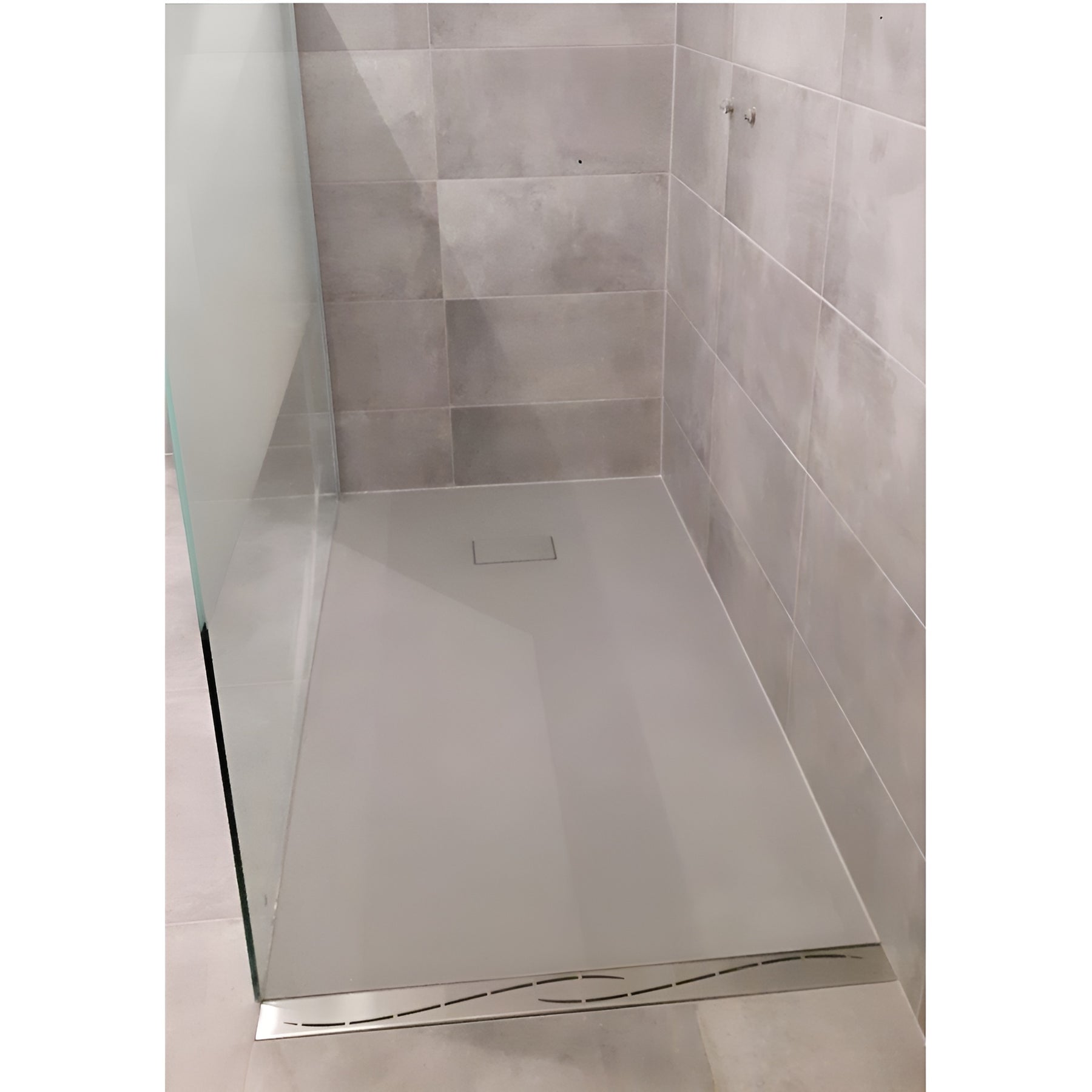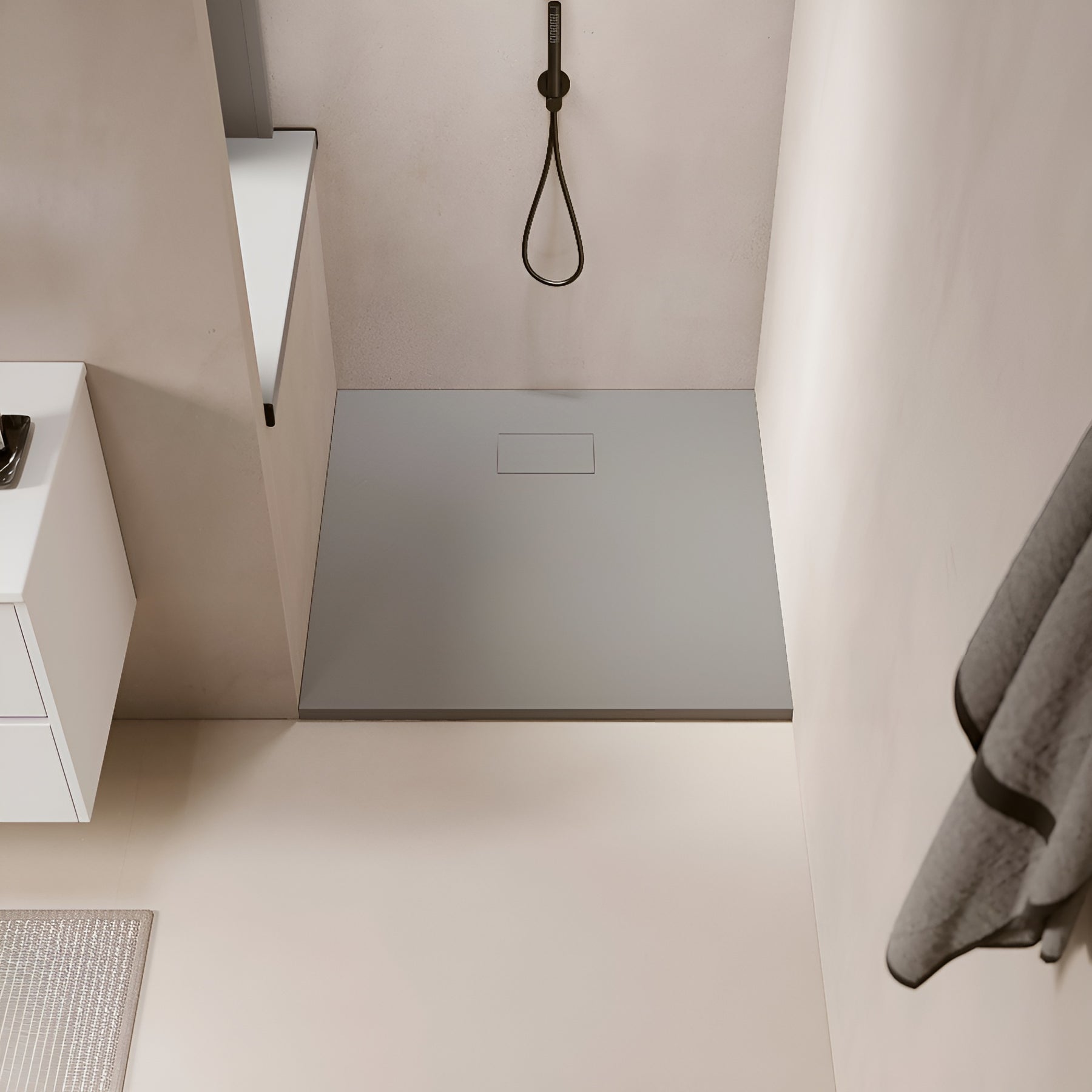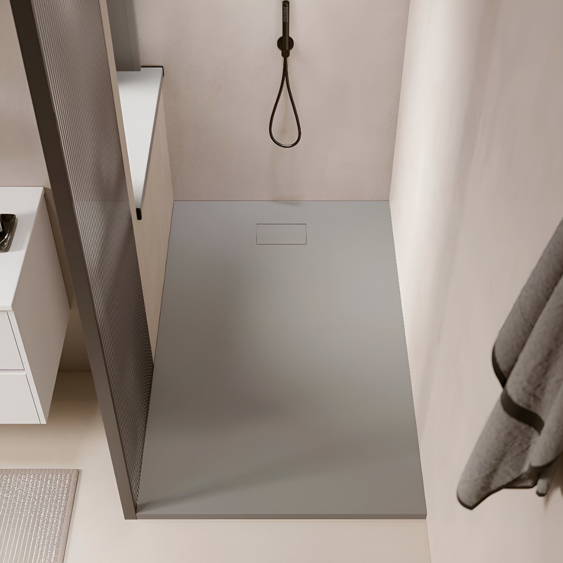 Les finitions sont travaillées de sorte que la bonde de douche disparaisse derrière un cache pré-installé, de finition ardoisée également et facile à entretenir.