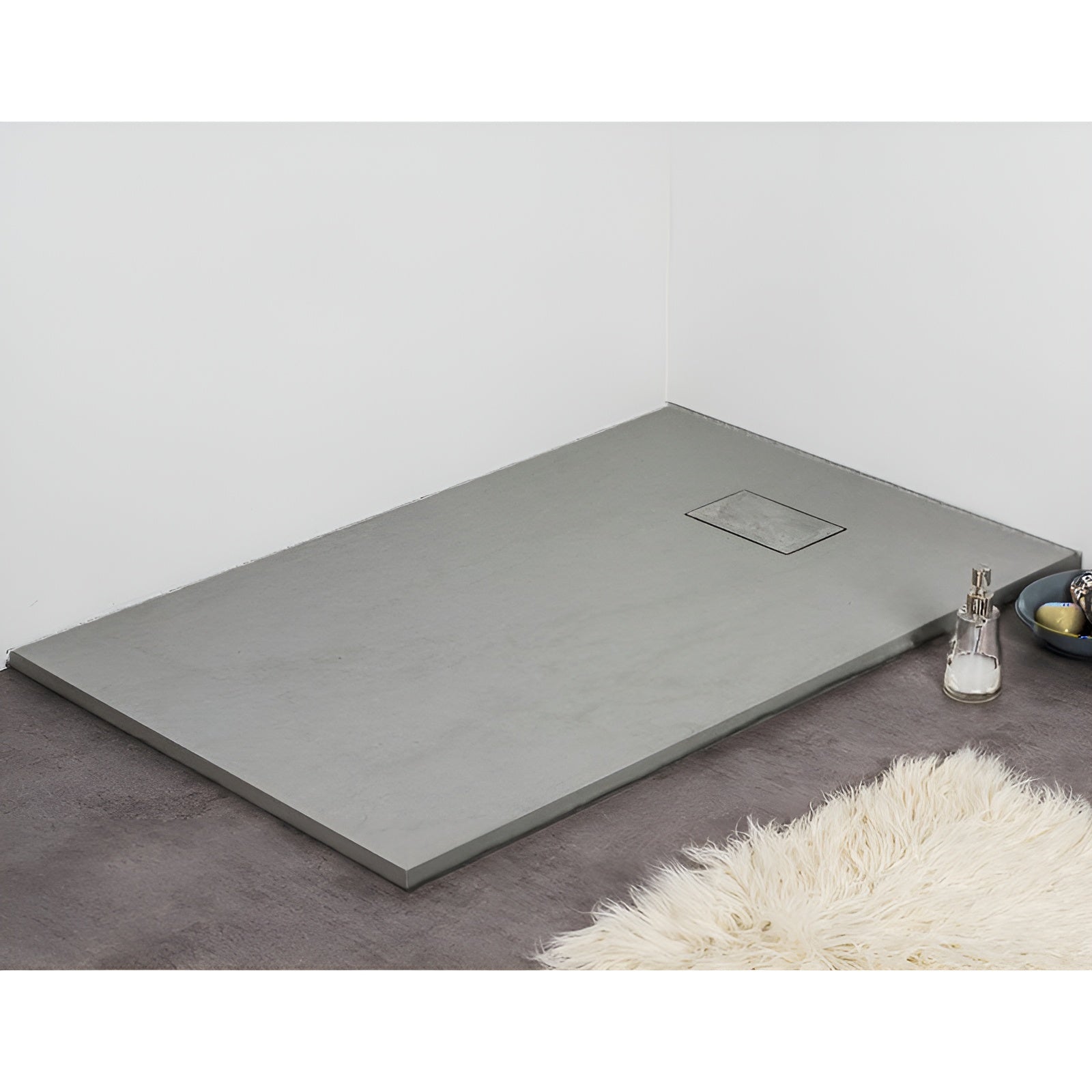 Receveur de douche extra plat gris PIATTO en SoliCast® avec cache-bonde inclus, pour une douche à l'italienne ultra-contemporaine.