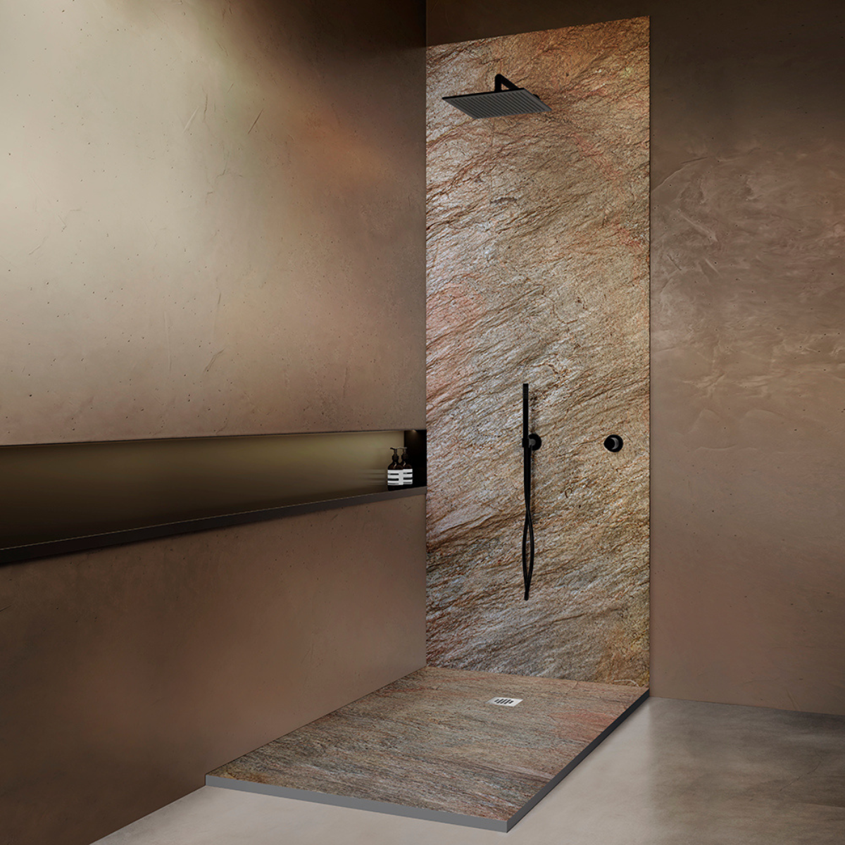Receveur de douche extra-plat en pierre naturelle cuprus, avec grille carrée en acier inoxydable, natte d’étanchéité pré-montée et siphon inclus, pour une douche à l’italienne moderne et raffinée.