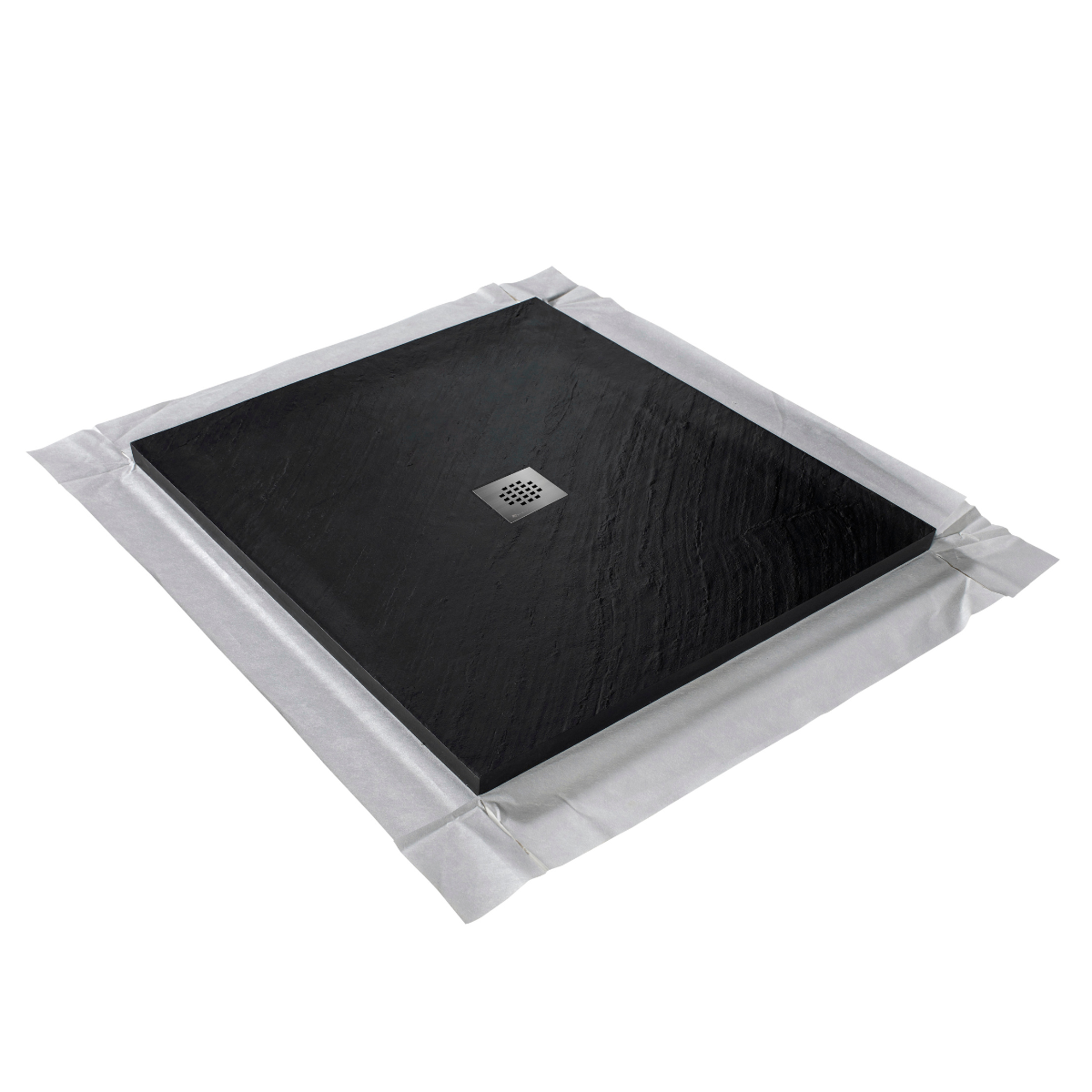 Receveur de douche extra-plat en pierre naturelle graphite, avec grille carrée en acier inoxydable, natte d’étanchéité pré-montée et siphon inclus, pour une douche à l’italienne moderne et raffinée.