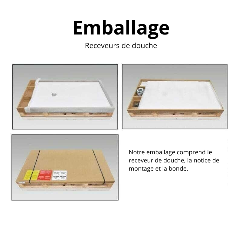 Avant l’installation : Il est recommandé de stocker le receveur de douche à l’horizontale et de niveau avec le sol. Assurez-vous que la surface est en parfait état. En cas d'anomalie ou de défaut, veuillez interrompre l'installation et nous contacter.