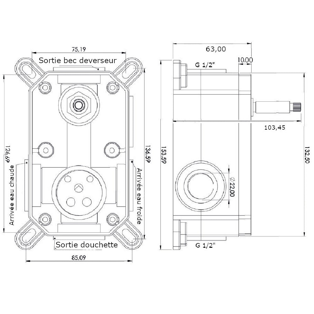 Un robinet mitigeur 2 voies encastré en laiton, raccords 1/2" ;