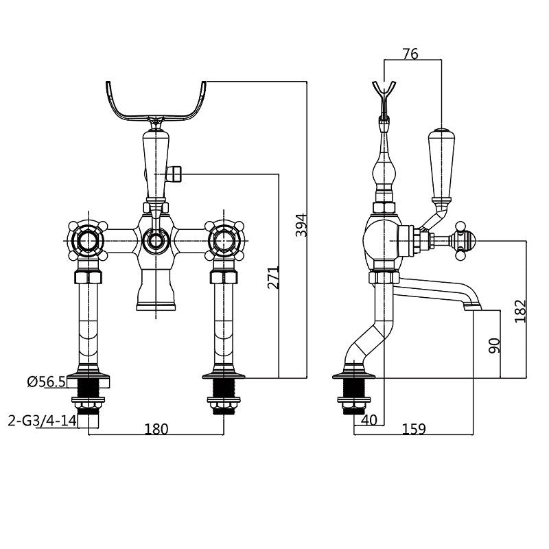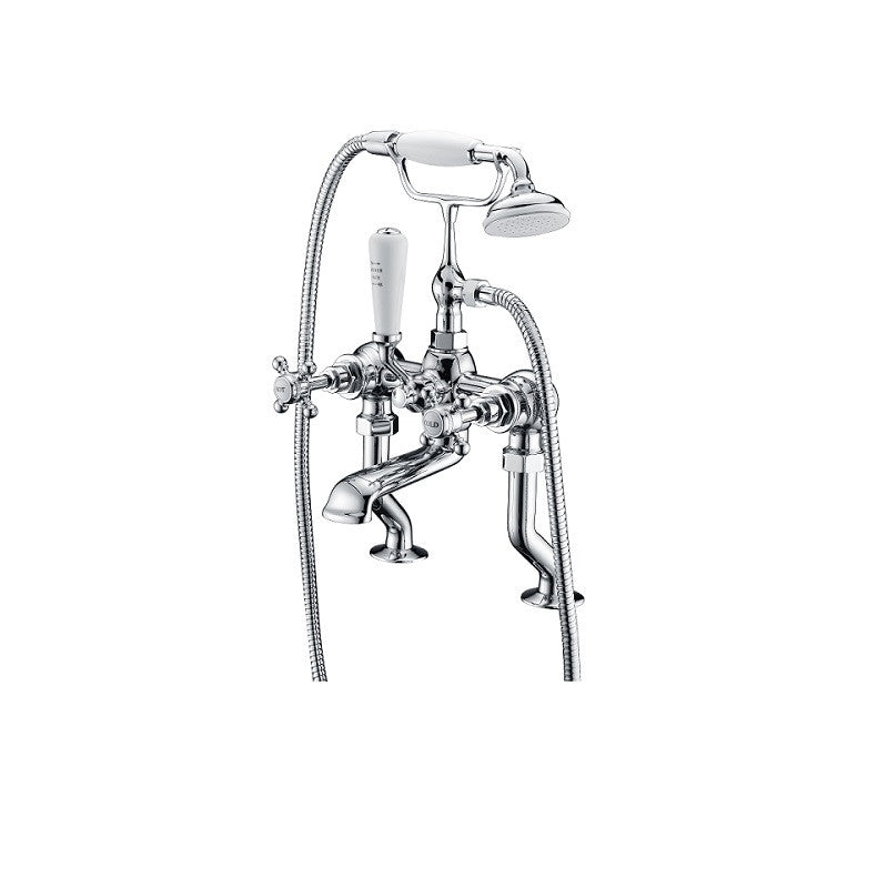 Robinet mélangeur sur plage de style traditionnel et ancien, avec manettes croisillons pour baignoire îlot rétro.