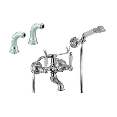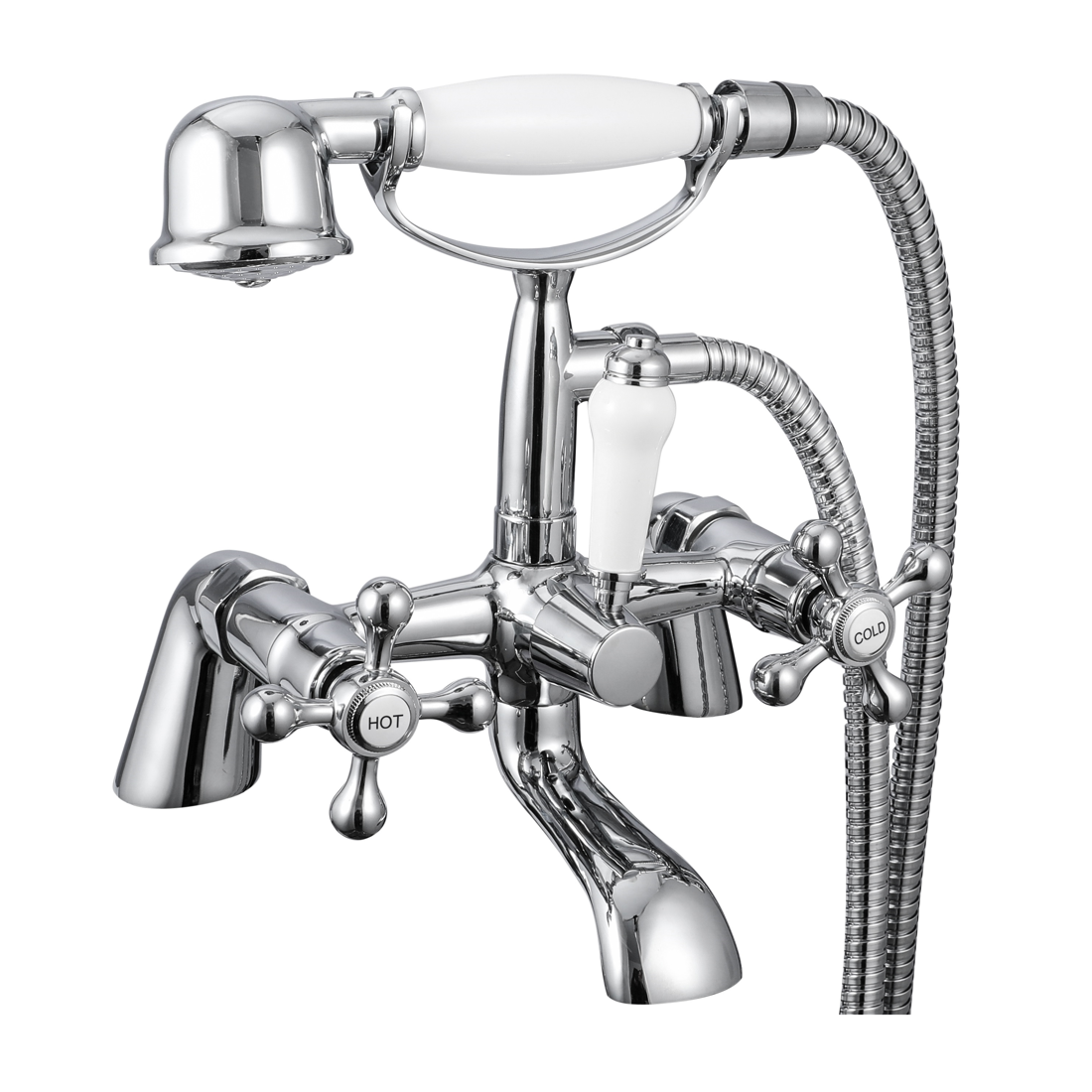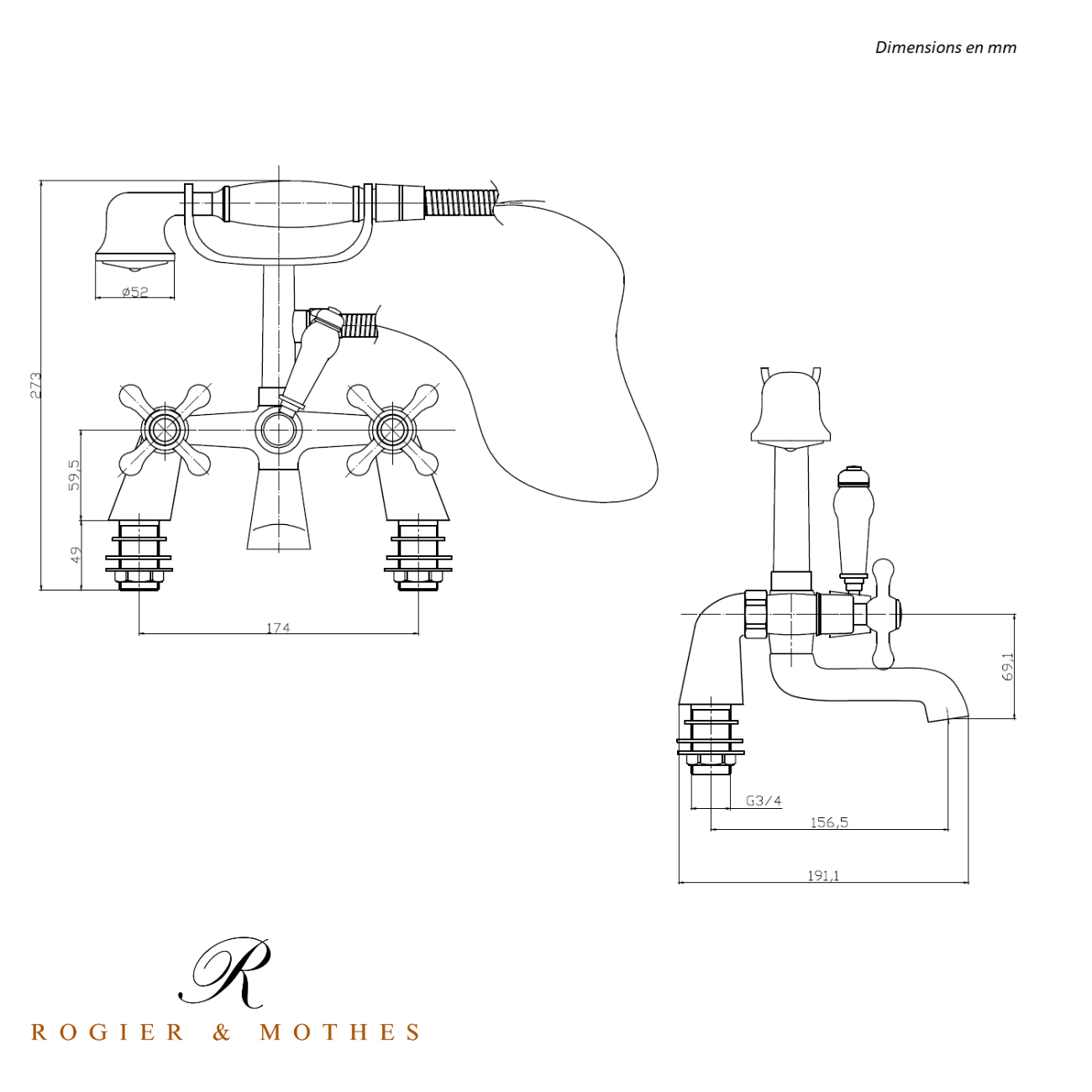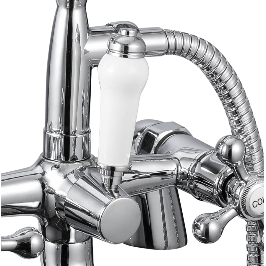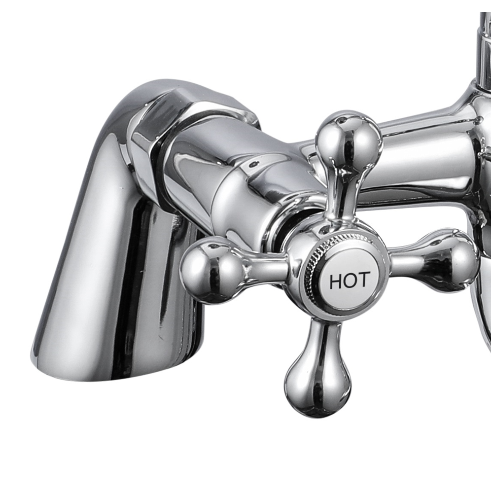 Robinet mélangeur sur plage de style traditionnel et ancien, avec manettes croisillons pour baignoire îlot rétro.