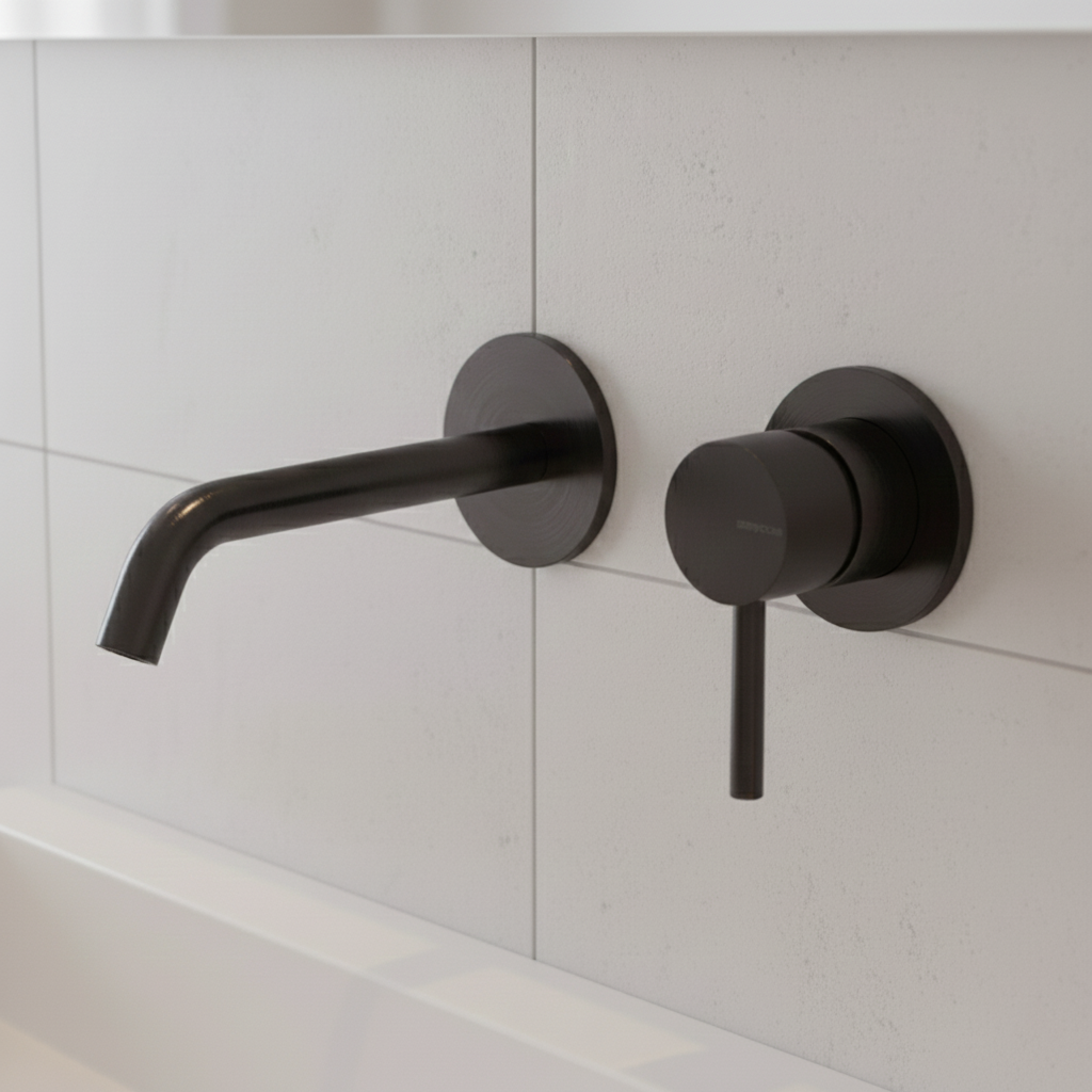 Robinet mitigeur mural de style moderne, pour salle de bain design, fixation murale avec boîte d'encastrement incluse.