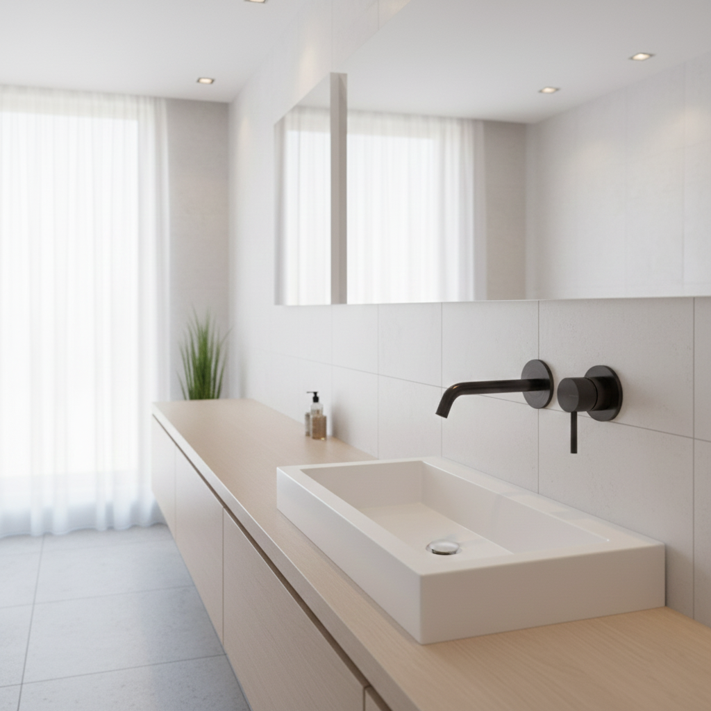 Robinet mitigeur mural de style moderne, pour salle de bain design, fixation murale avec boîte d'encastrement incluse.