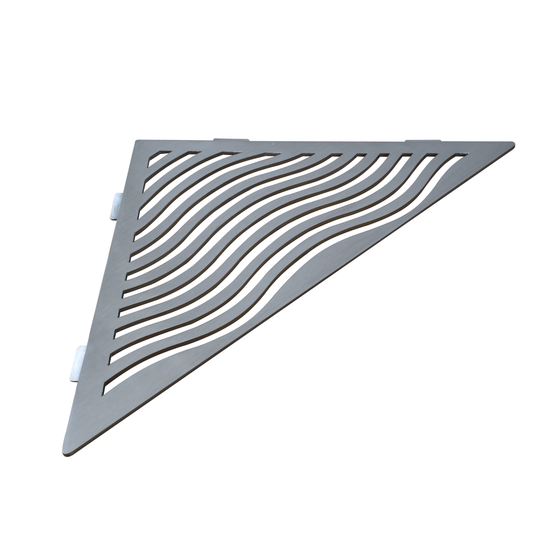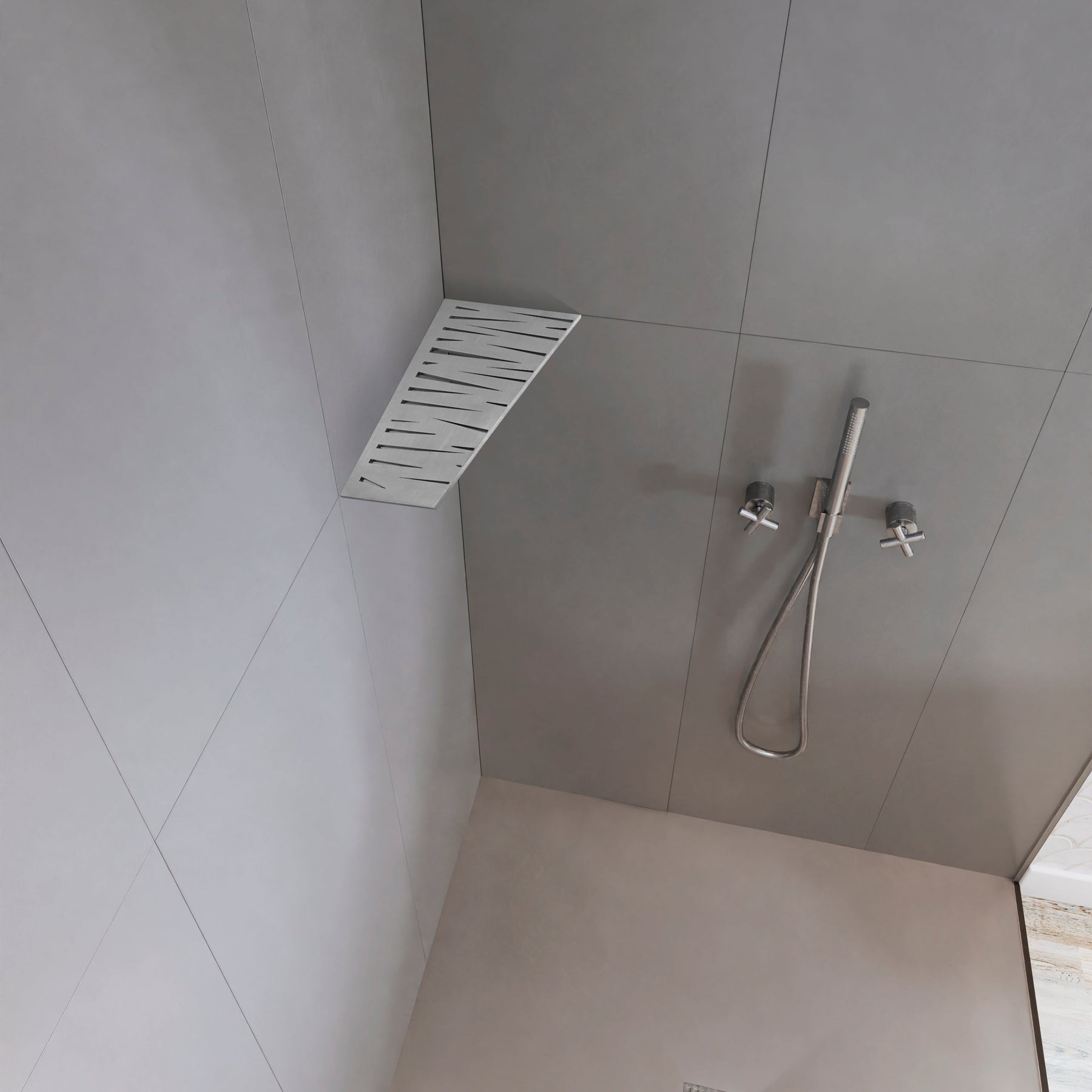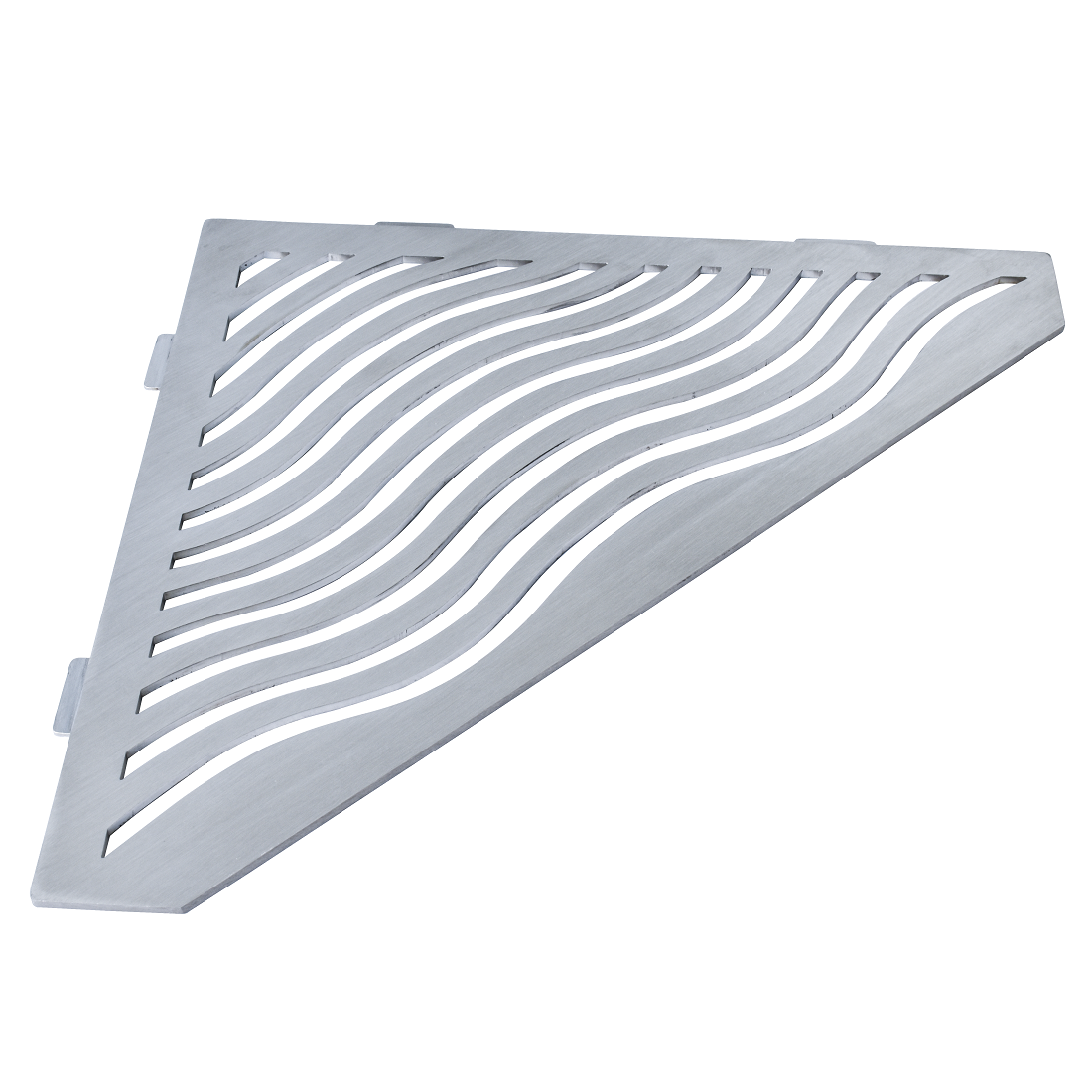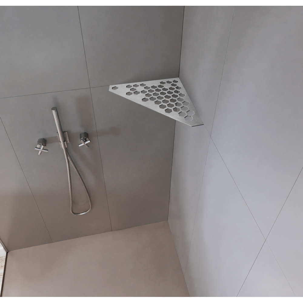 Tablettes d'angle, à fixer aux joints de carrelage, 12 modèles, acier inoxydable brossé, pour tout type de salle de bain.