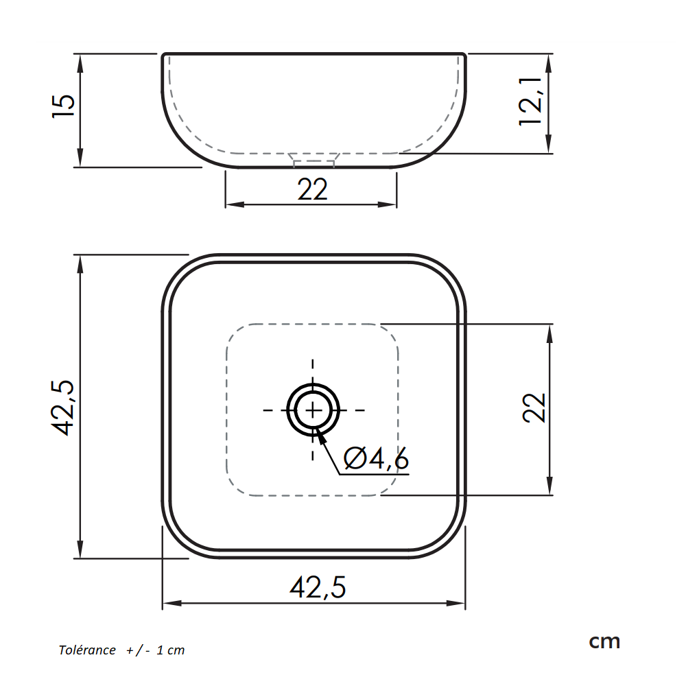 Dimensions : carré, L. 42,5 cm x l. 42,5 cm x h. 15 cm. Tolérance + ou - 1 cm.