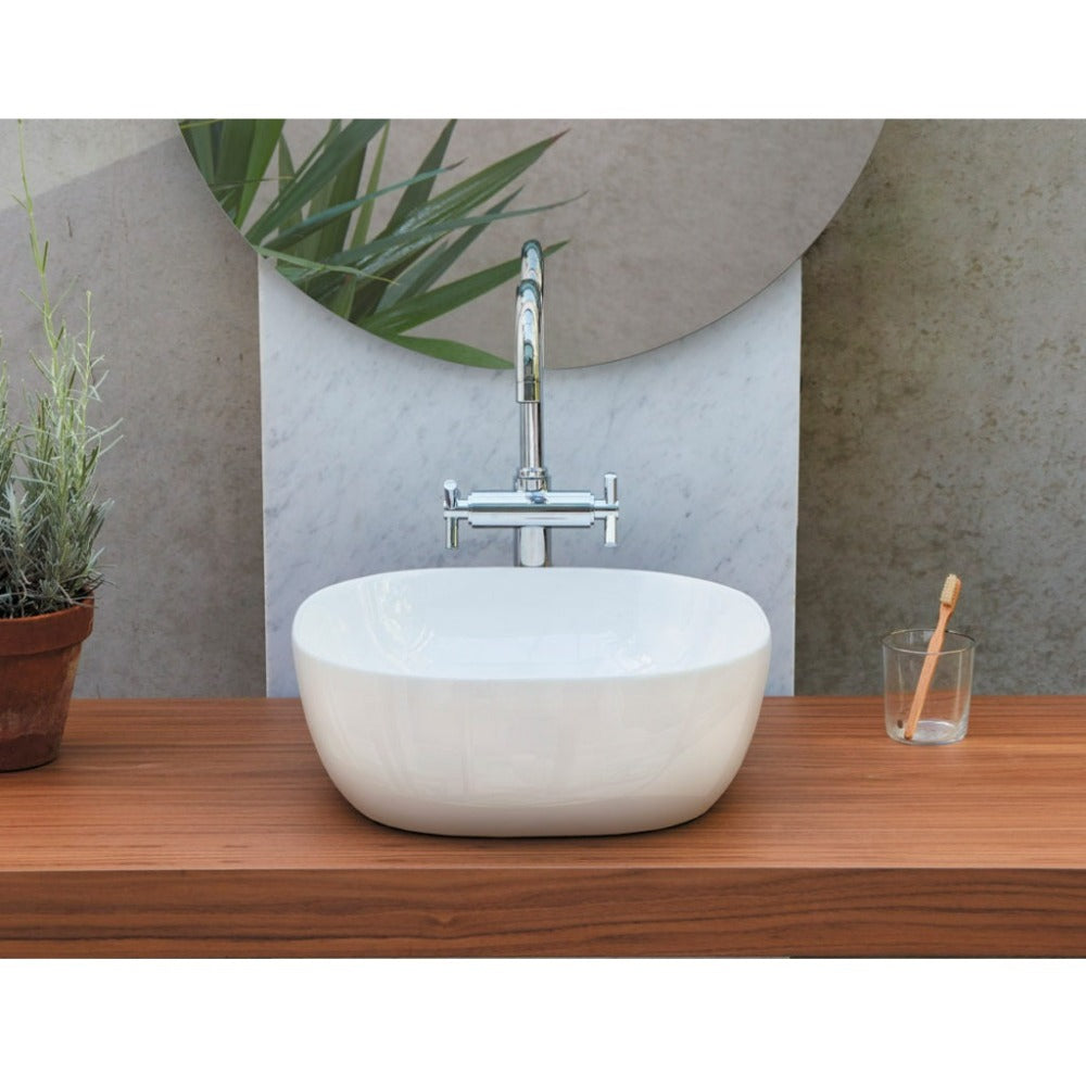 Vasque à poser en céramique vitrifiée PALERMO de forme carrée et de finition blanc brillant. Dimensions 42,5 x 42,5 x 15 cm.