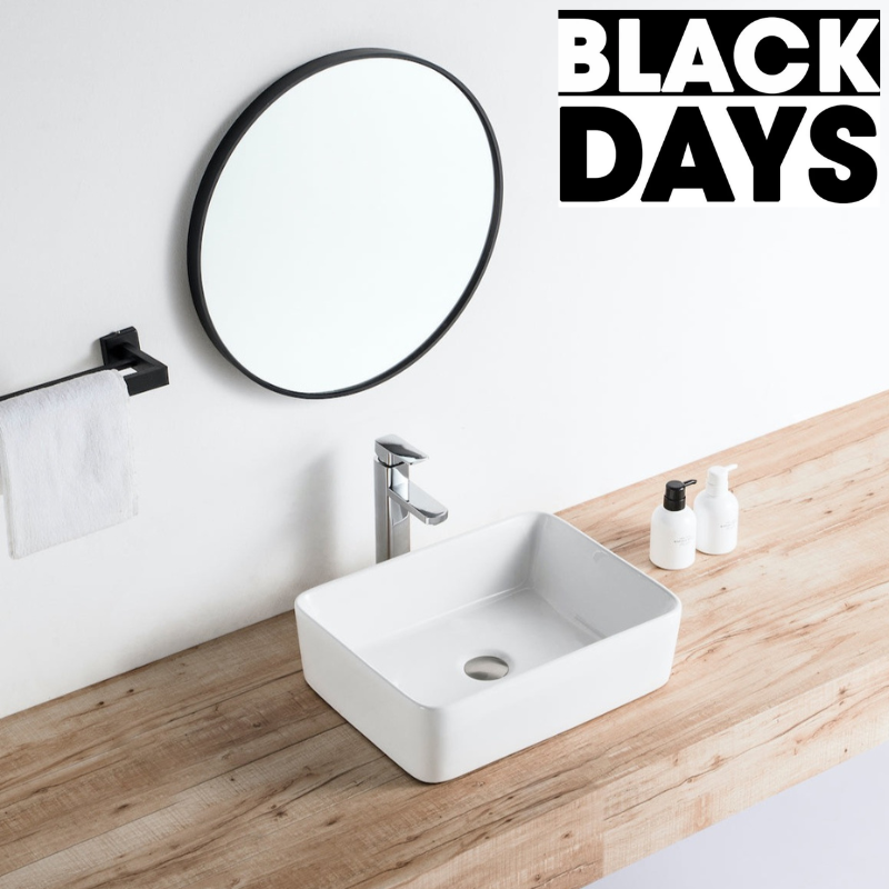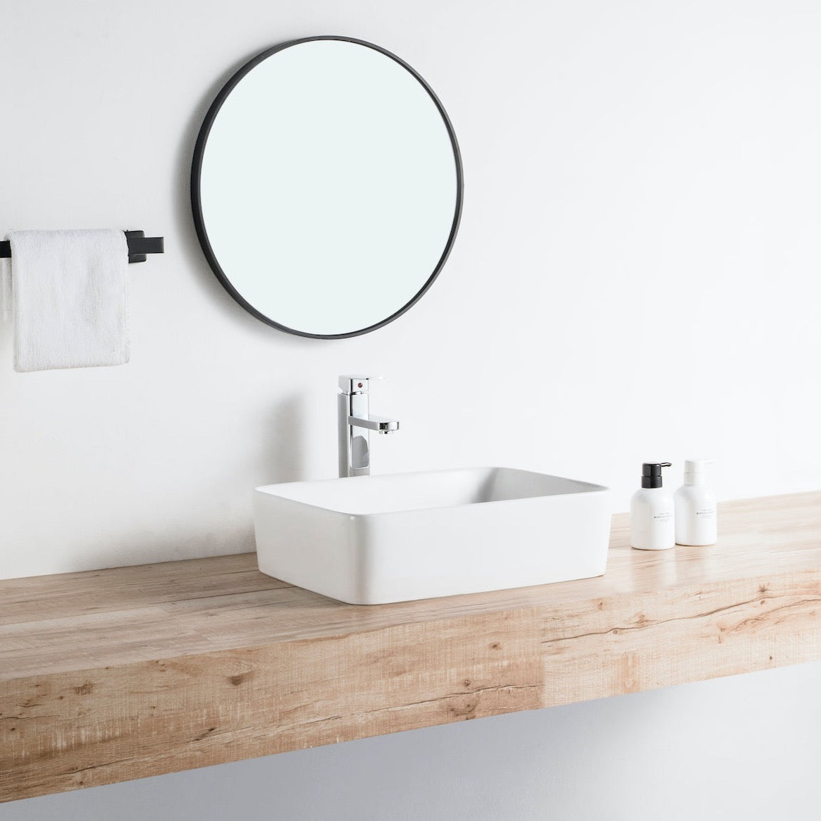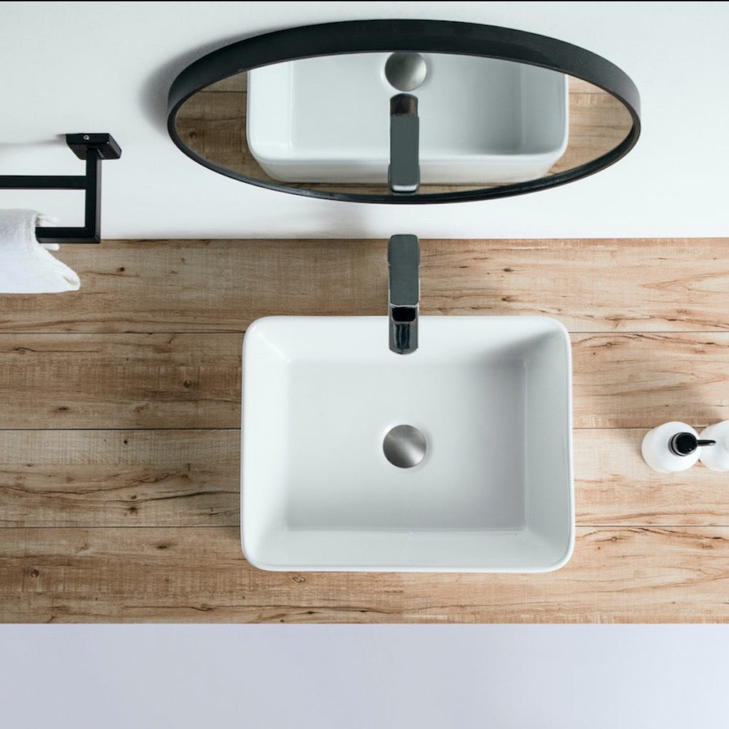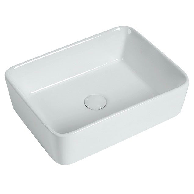 Vasque à poser de forme rectangulaire, en céramique vitrifiée finition blanc brillant, apportant une touche contemporaine à votre salle de bain.