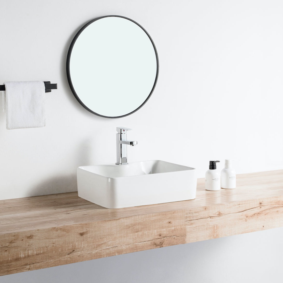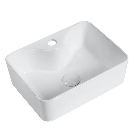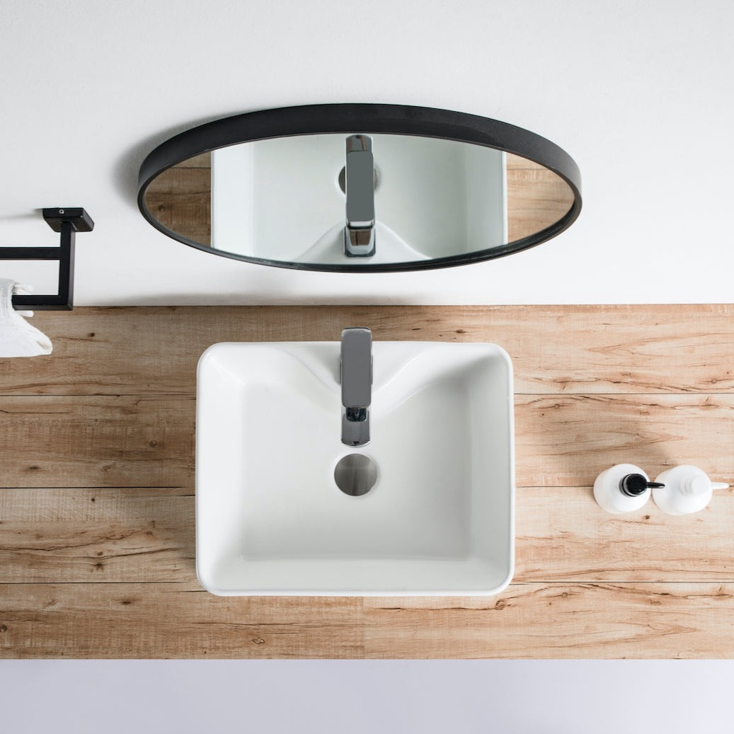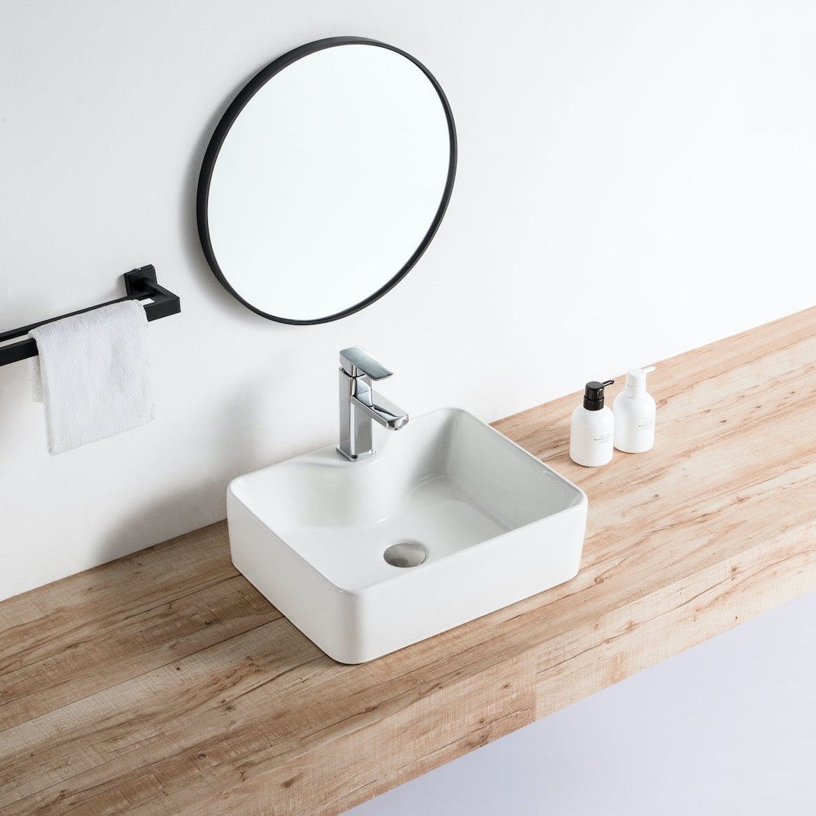 Vasque à poser de forme rectangulaire, en céramique vitrifiée finition blanc brillant, apportant une touche contemporaine à votre salle de bain.