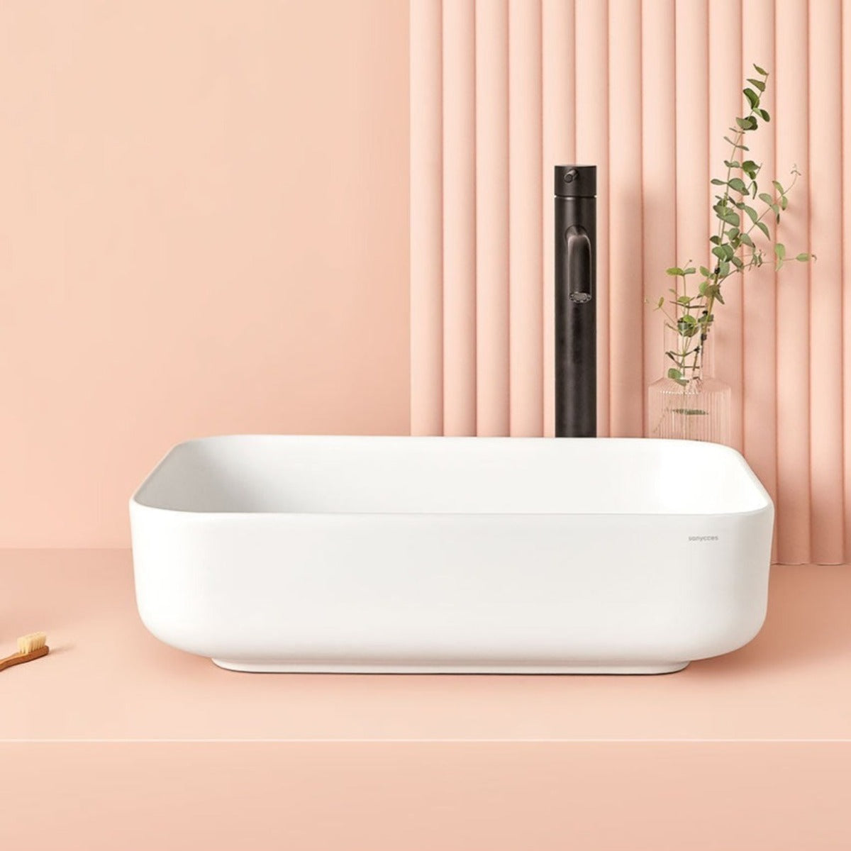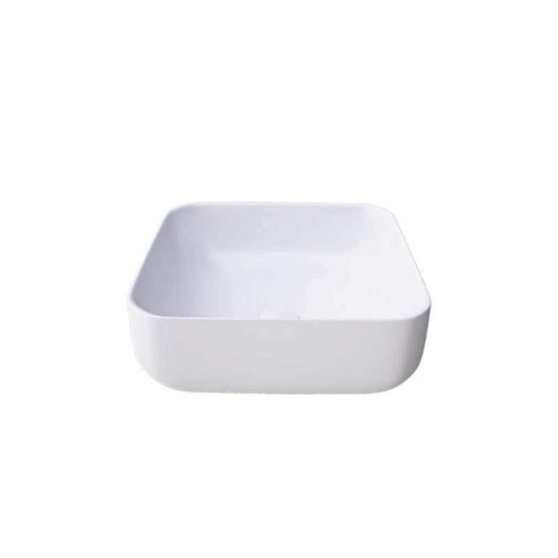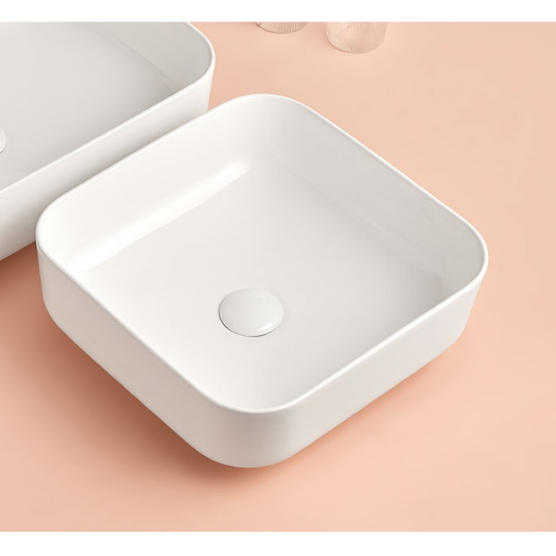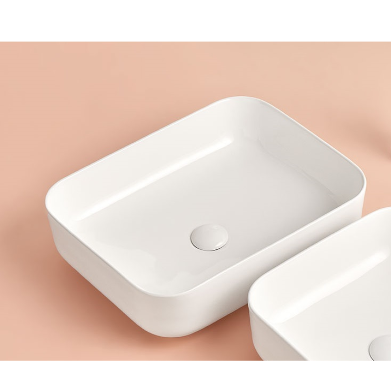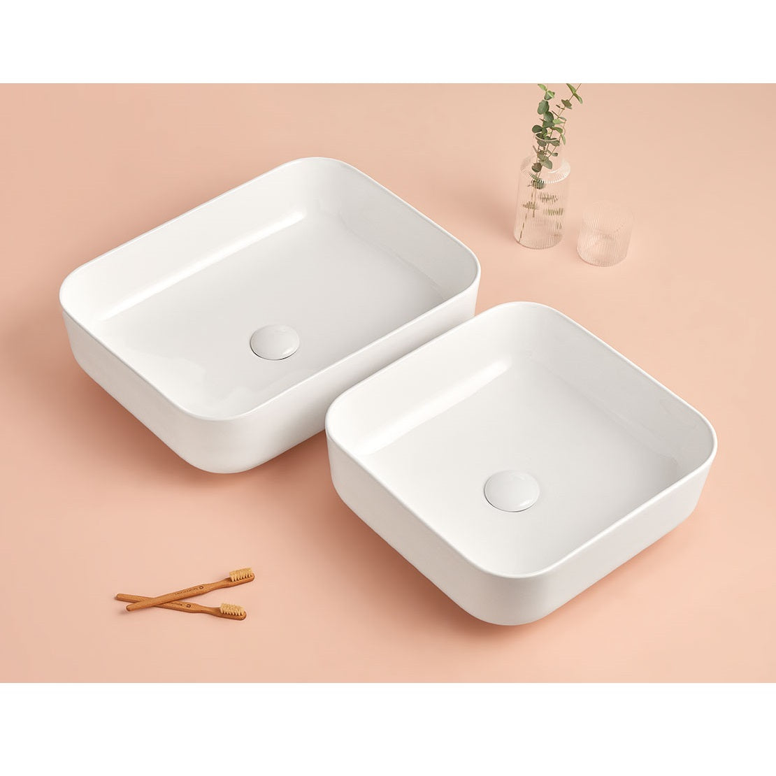 Vasque à poser CATANIA, de forme rectangulaire ou carré, en céramique vitrifiée finition blanc mat ou brillant.