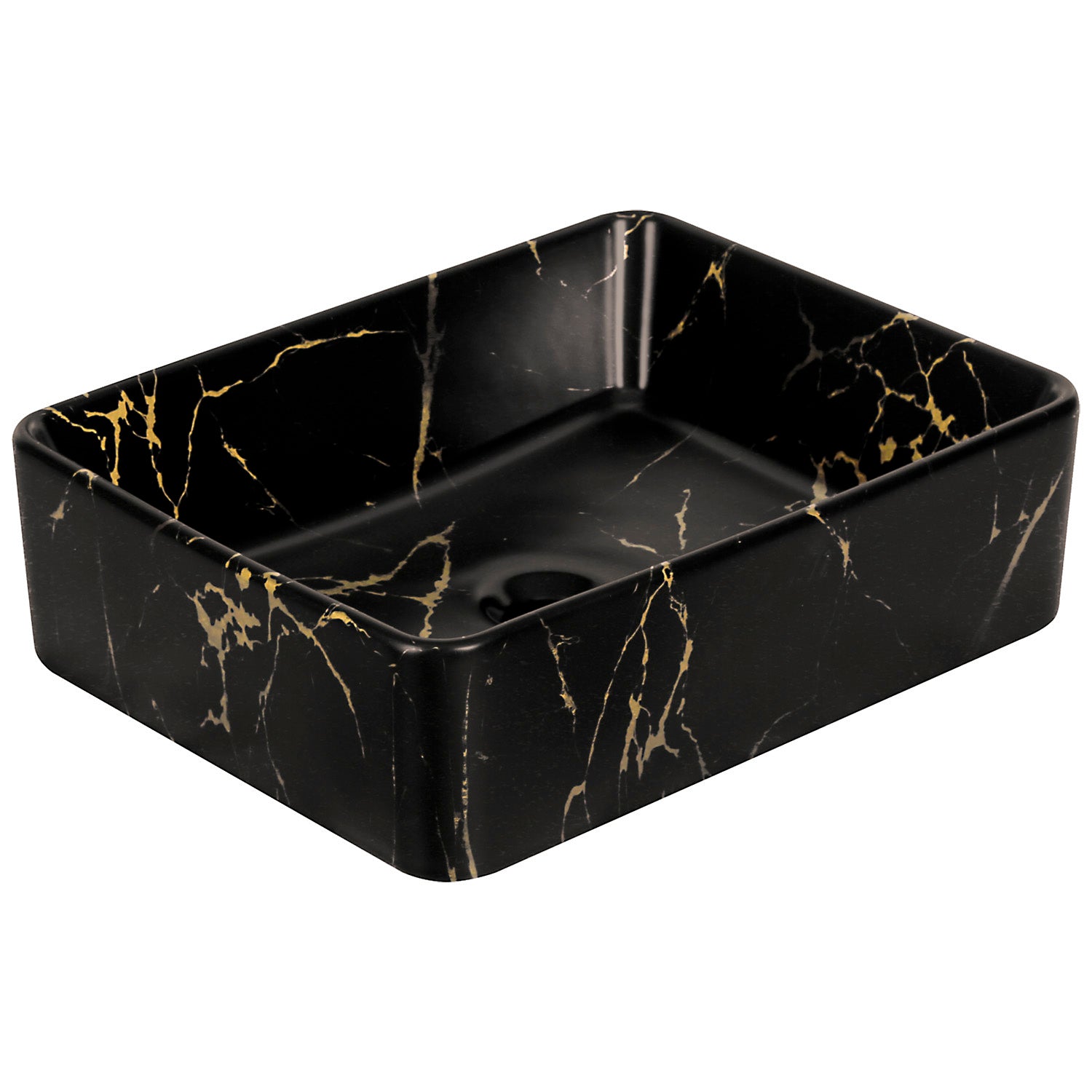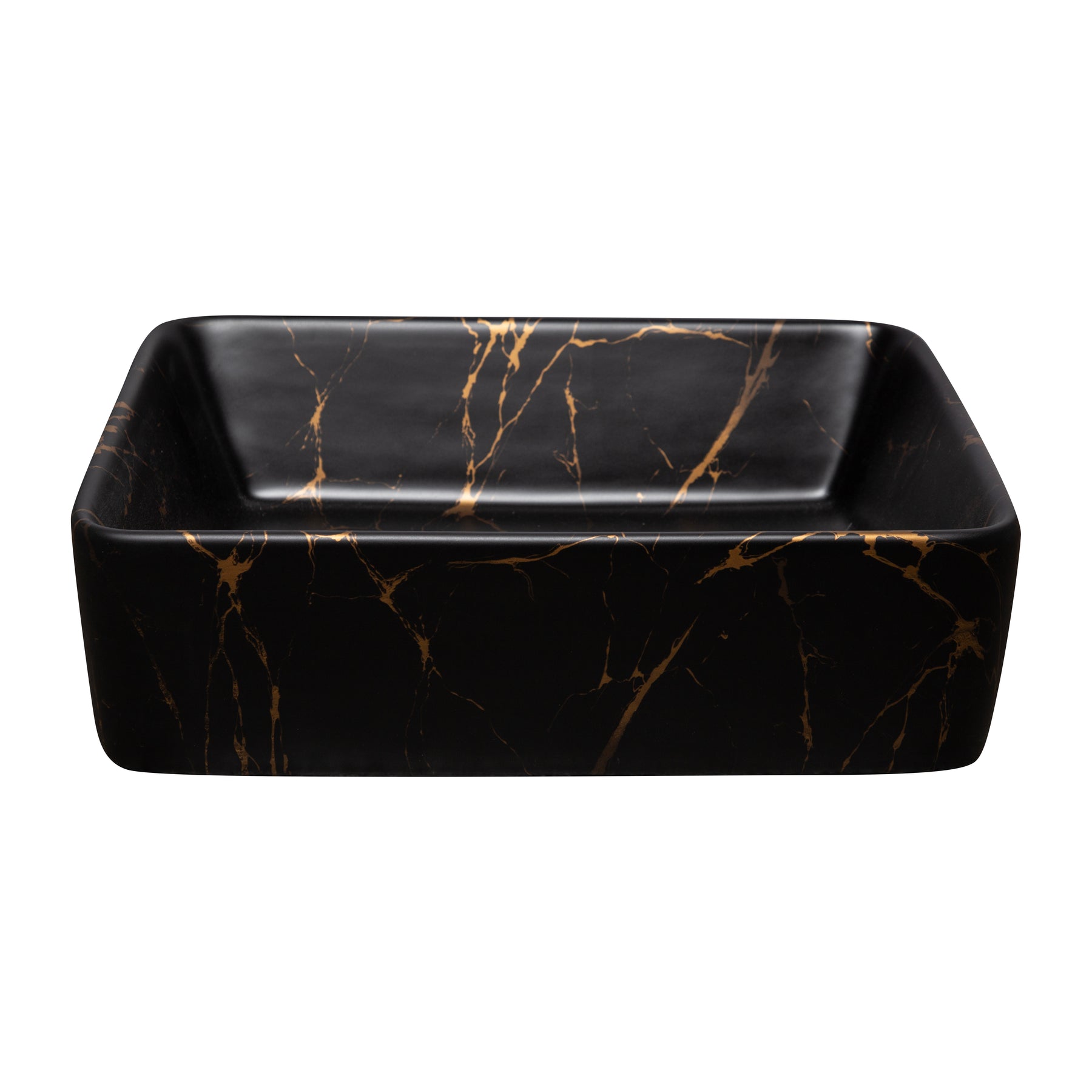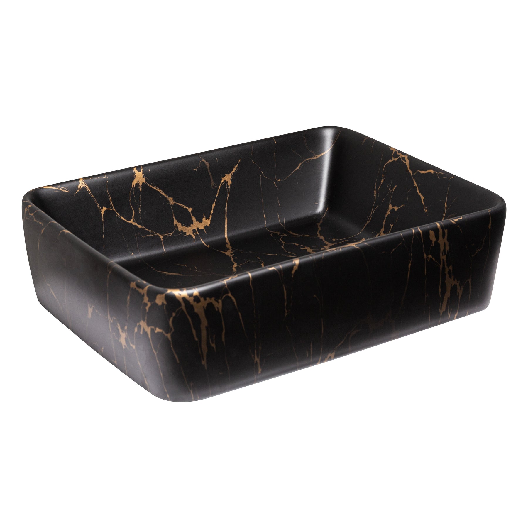 Vasque à poser de forme rectangle en céramique, finition marbré noir semi-mat et or, apportant une touche ultra-design à votre salle de bain.
